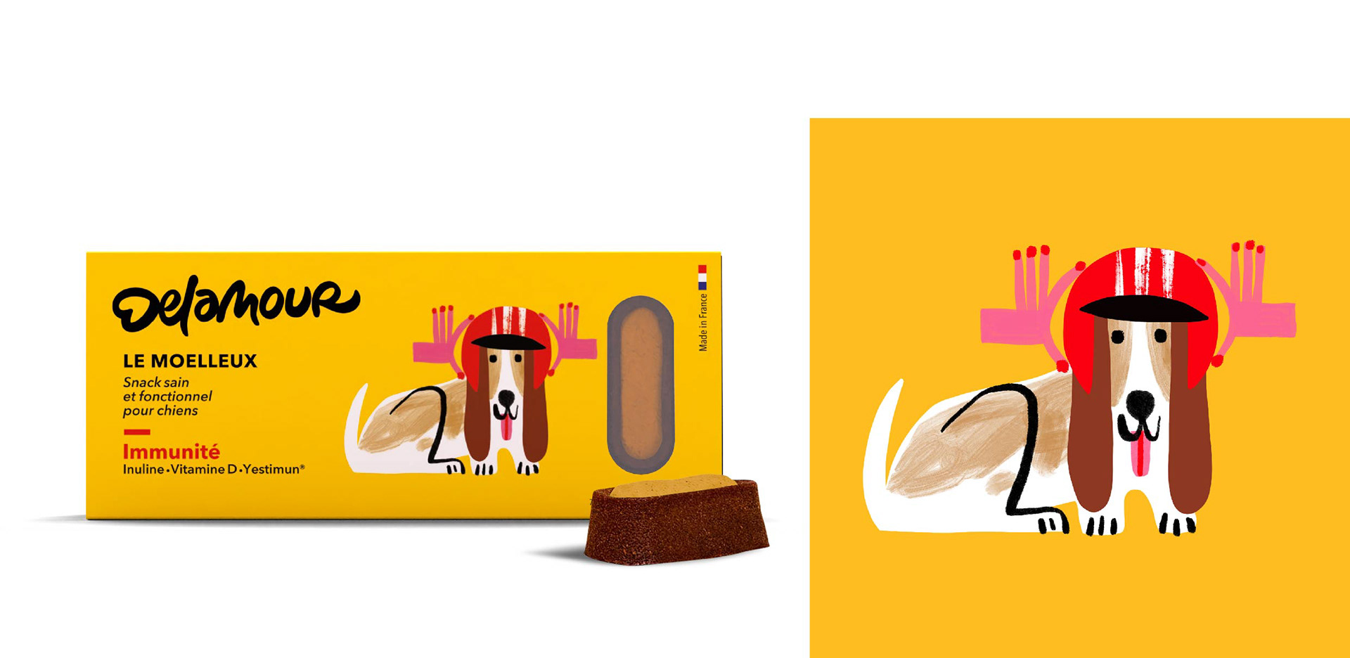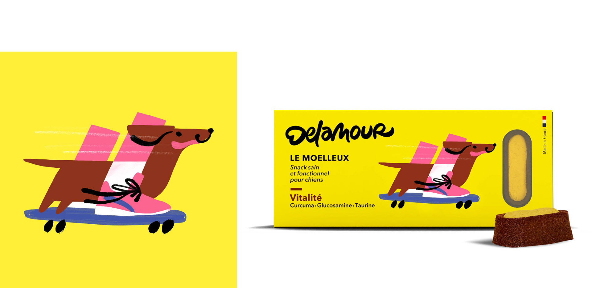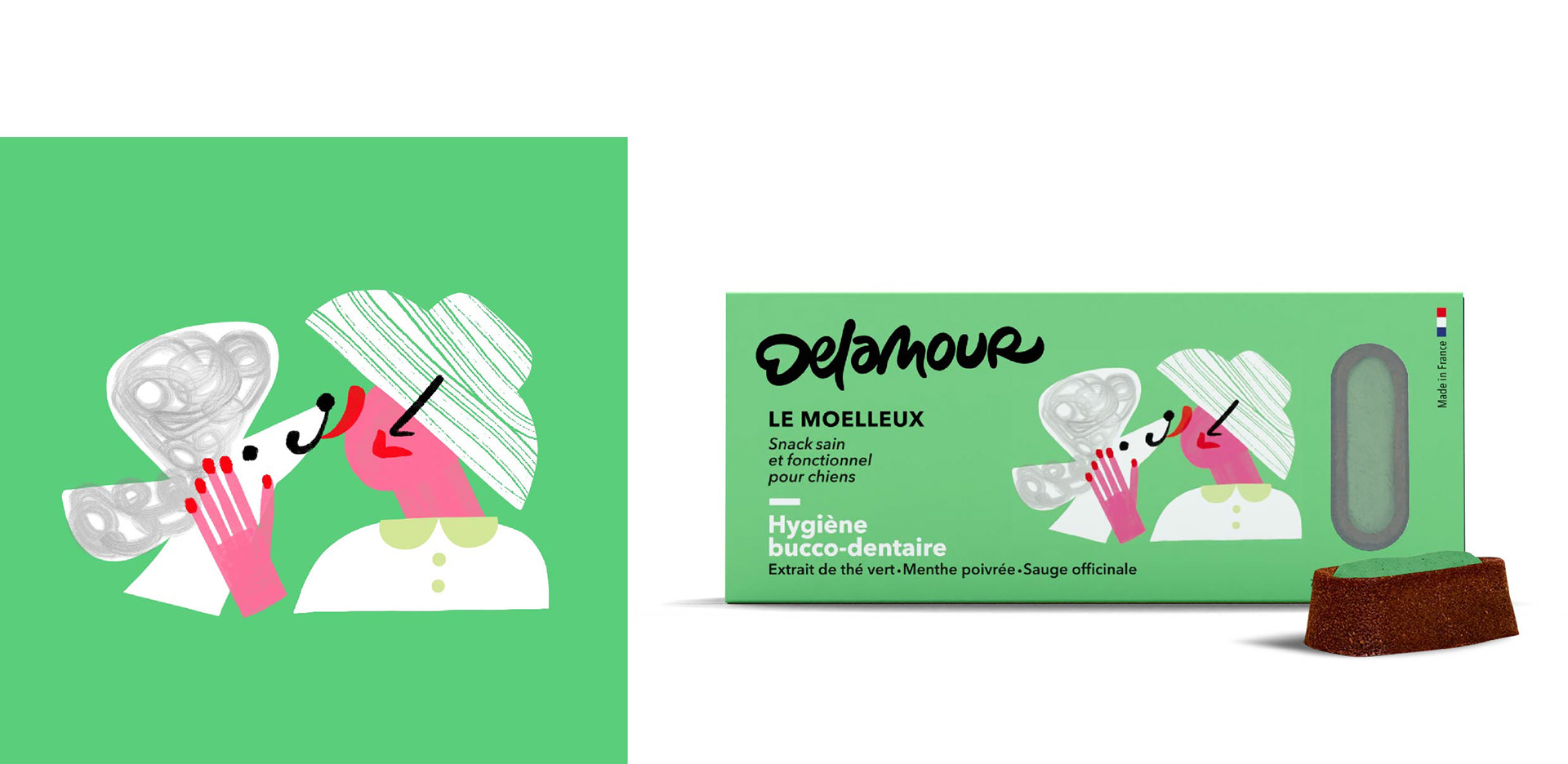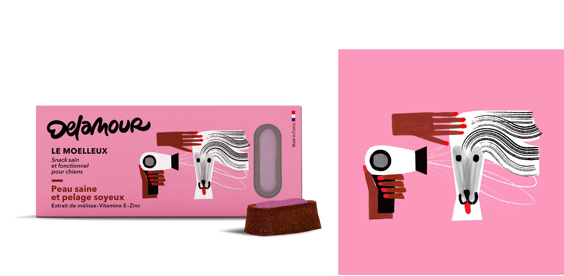 Illustrations for Delamour, healthy food for dogs. Packaging, retail and social network communication. This work was made in collaboration with Laurent Muller, art director.